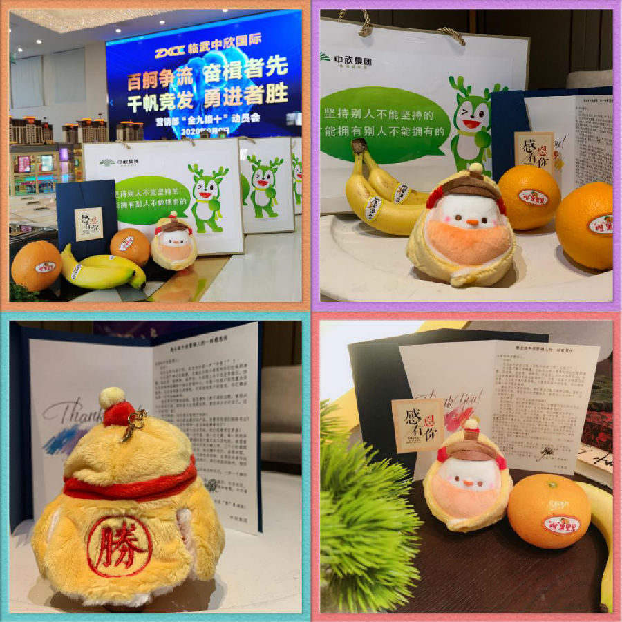 此次动员会,中欣工会精心为营销、策划同事们准备了董事长亲笔鼓励信,还有寓意着“成交”的橙子和香蕉,带着“前行路上,将军凯旋,得胜如意”祝福的故宫博物馆文物衍生品——戴胜如意。以此来感谢日夜奋战在营销最前线,为公司的发展做出了巨大贡献的营销、策划人,也预祝各位同事能以百倍的信心,携手前行,不忘初心,不畏艰难,紧跟公司步伐,努力拼搏,冲刺和完成全年的经济目标。